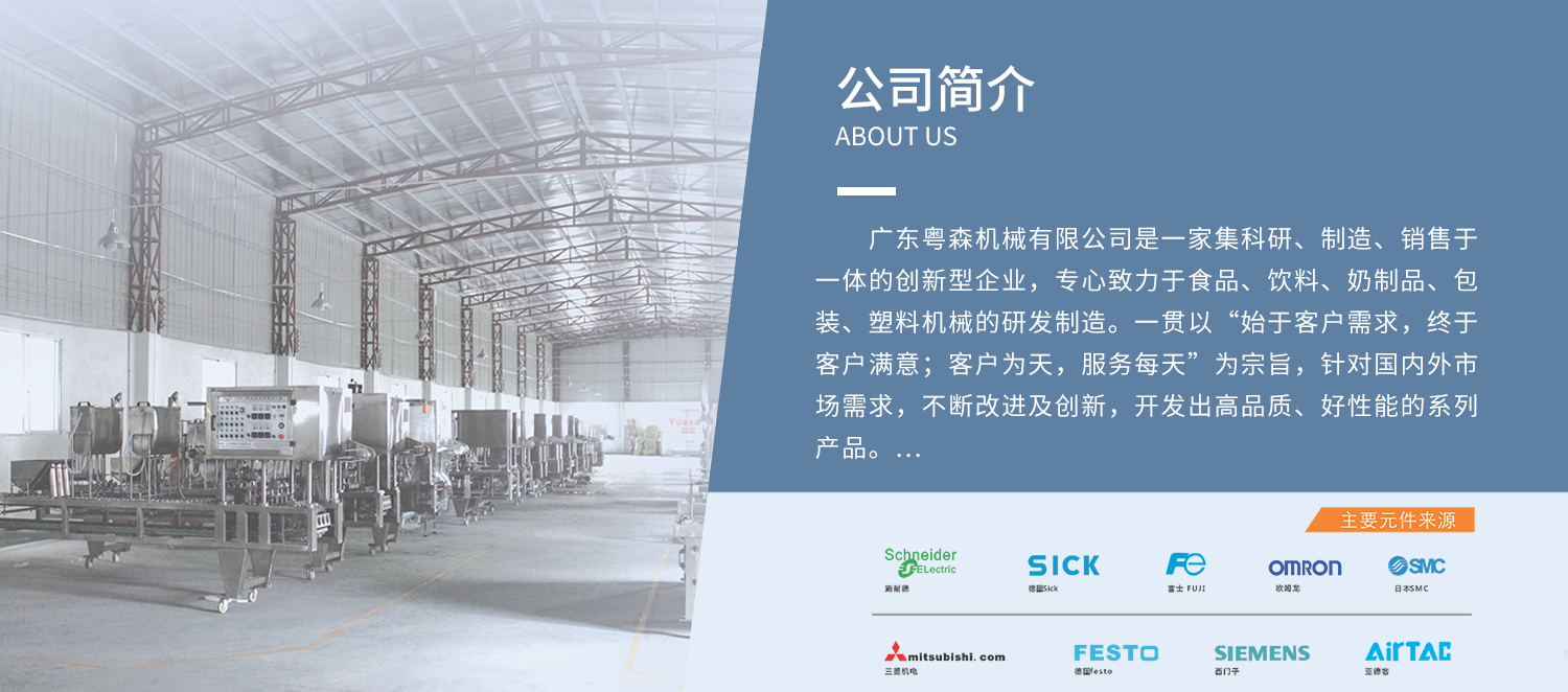 - 廣東粵森機(jī)械有限公司是一家集科研、制造、銷(xiāo)售于一體的創(chuàng)新型企業(yè),專(zhuān)心致力于食品、飲料、乳制品、包裝、塑料機(jī)械的研發(fā)制造。